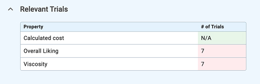 Calculated properties are properties Alchemy is auto-calculating based on all materials and their quantities, using an expression defined when a property is created. Calculations of these properties are displayed below the Trials table in the Workspace record for each trial as editable fields - see Calculations for more information.