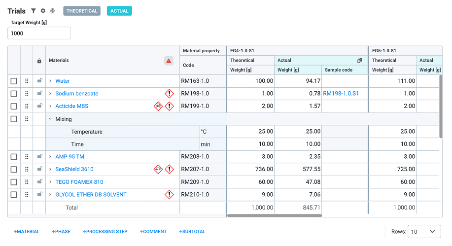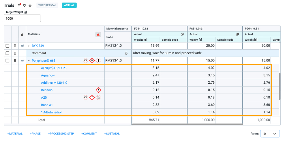 Inside the Trials table, the first column is reserved for a lock/unlock feature. By default, all rows are unlocked. Clicking on the empty cell to the left of the desired row in the Materials column, a lock icon will be displayed. A locked row enables the following: