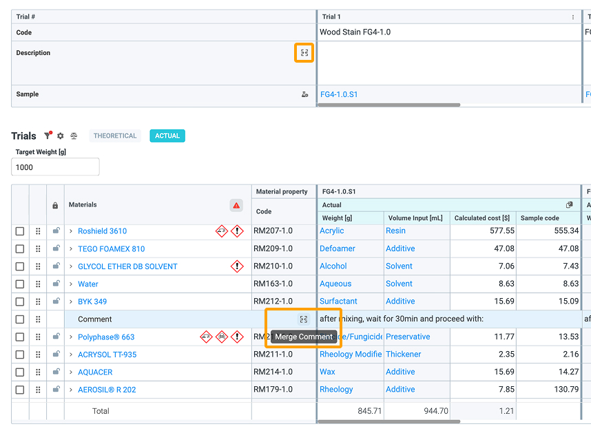 Split / Merge functionality enables users to control how comment and description fields are displayed across multiple trials in the formulations and general (where description field are) table. This helps manage screen space and organize comments and descriptions more effectively.