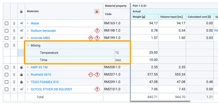 Materials can be added in bulk and will appear in the table in the order in which they were selected. For any added materials or processing step, you can specify columns: