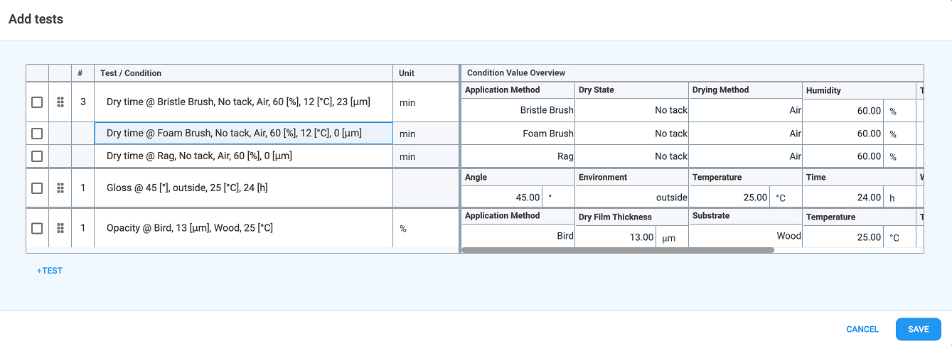 Tests are properties tested by users in the Lab, leveraging a single property or Test Methods, which is a group of properties. The defined targets for these properties will preset the Testing section of the Workspace record - see Tests for more information.