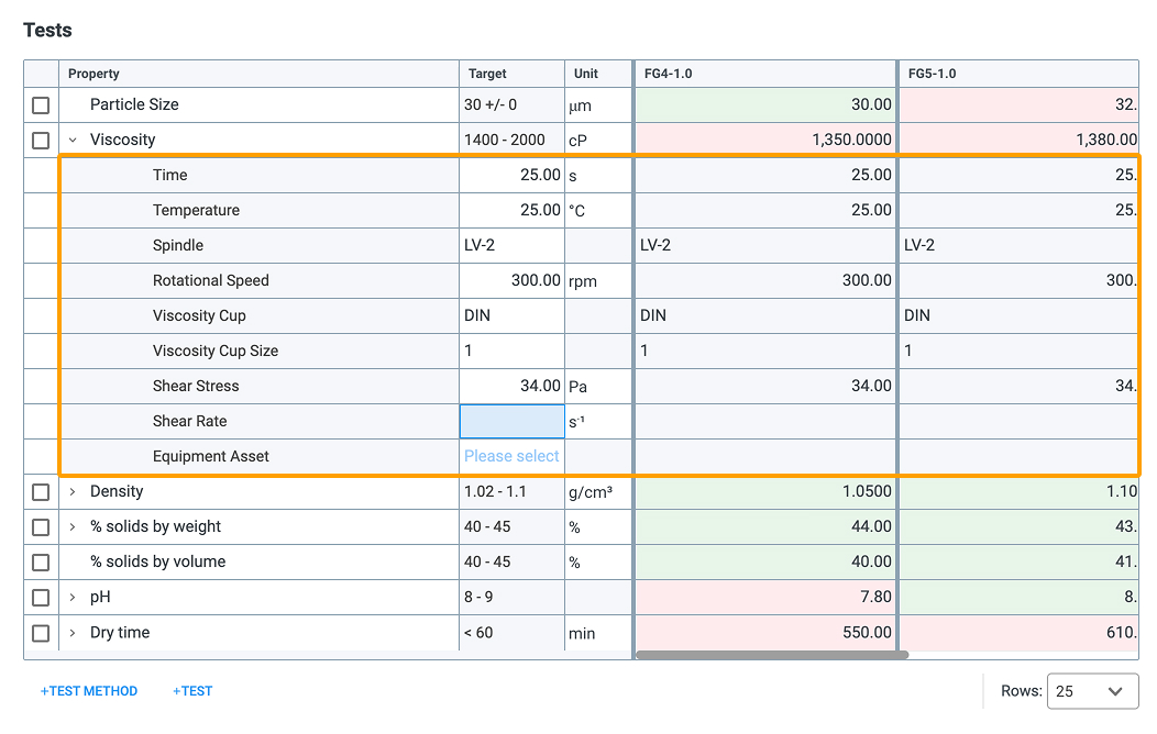 The Tests table provides the user a place to notate their test results for actual trials. The measured properties and their respective target values will be pre-populated from those entered in the Lab Book Overview record.
