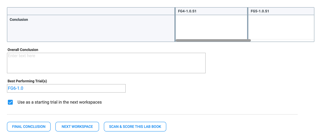 At the bottom of the Lab Book Overview record is the Scan & Score button. This opens the Matching Trials component, where the system will find the best matching actual trials (Samples) from your historical database based on the given requirements, targets, and constraints.
